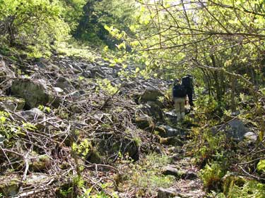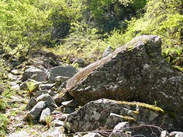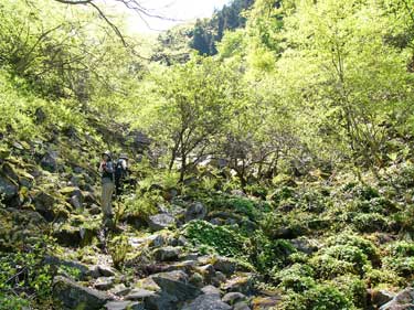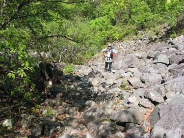 これより上部は枕状溶岩に覆われた岩ゴロの急登になり、右手にケルンが現れると