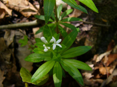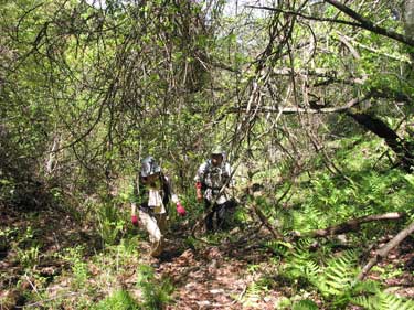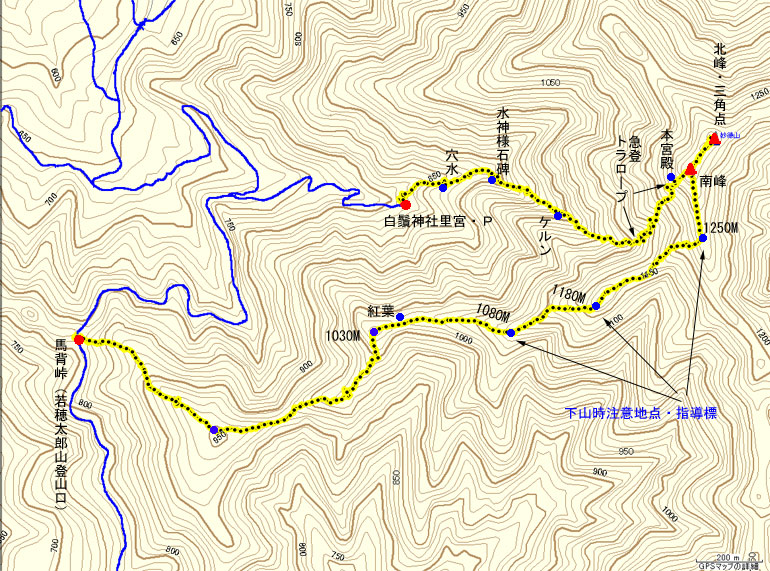 白鬚大明神の立札横から入り、白鬚神社の石祠前を横切って杉林を緩く下ると林道からの