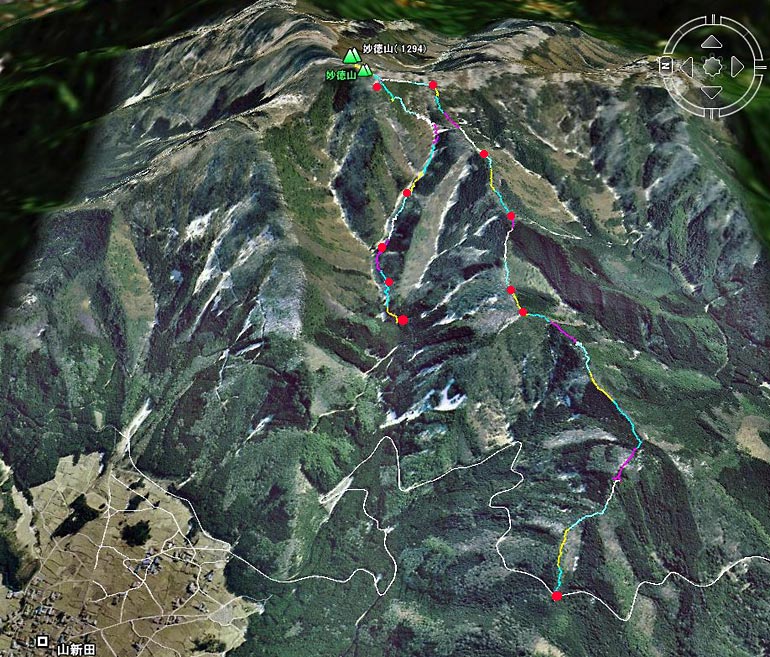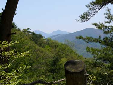 木造の本宮殿を右に巻いて5分ほど上ると妙徳山南峰だ。南峰からは正面に北アルプスや