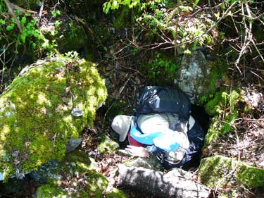 右に折れてシダ類が生い茂る登山道を暫く進むと、知る人ぞ知る隠れた名水「穴水」に出る。