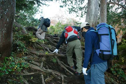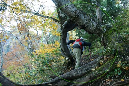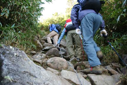 @木の根っ子トンネル A四合目・水場 B五合目 C水場 Dクサリ&ロープ E六合目 F七合目&ヒカリゴケ