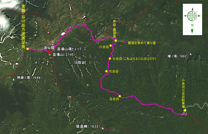 G岩場ロープ&クサリ H八合目 I坪場 J岩ゴロ道 K苗場山東肩・谷川岳方面展望良