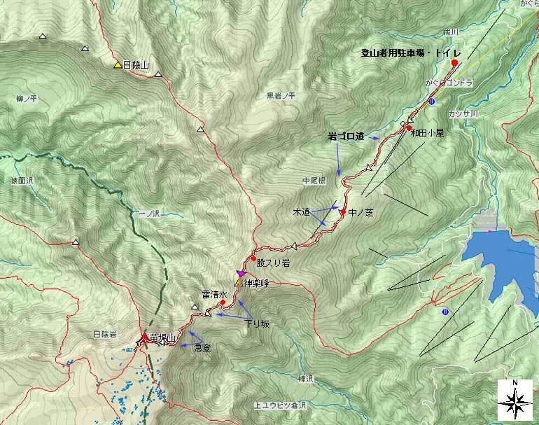 | かぐらみつまた第二リフト町営駐車場・トイレ有 | 登山道入り口 左側車道を歩いても良いが直進でショートカット可 |