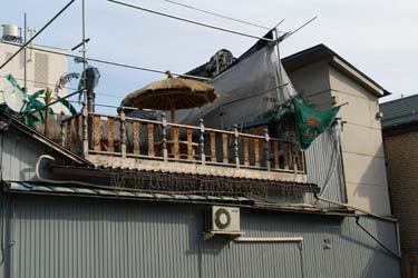 | 鳥のエサ台かな? | 《写真にマウスを》 屋根の上は別世界? ⇔ なんのお店だろう? |