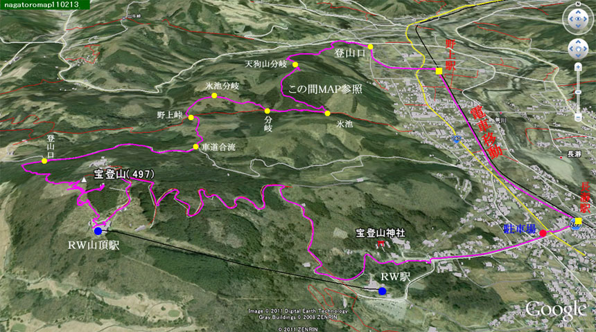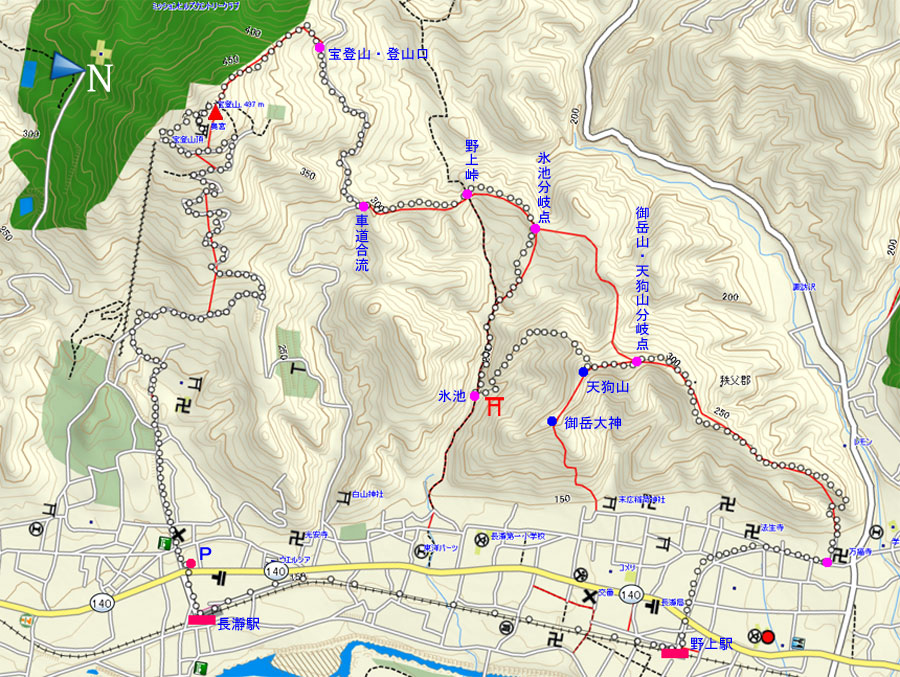 | (計曲線 50M 主曲線 10M) 野上駅標高/138M 標高差/359M 総歩行距離/11.107M |