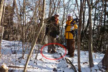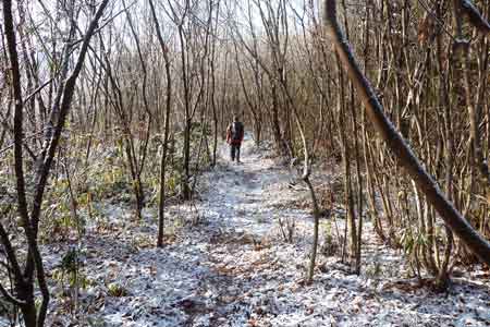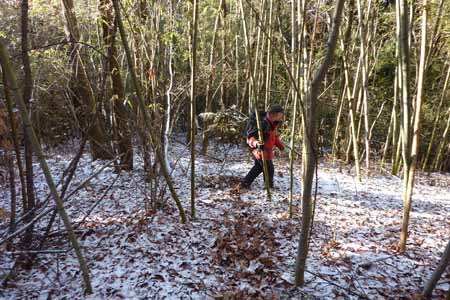 | 御岳・天狗山分岐に戻らず途中で見かけた踏み跡を辿ることに ナビをチェックしながら慎重に下る |