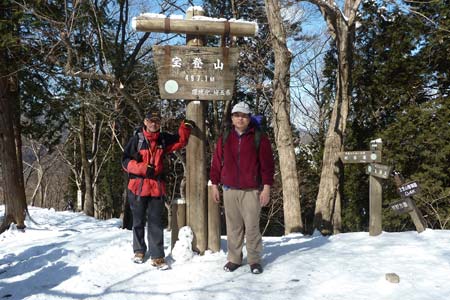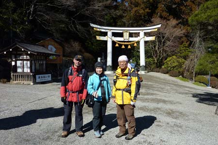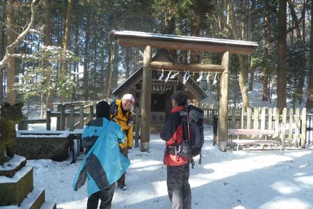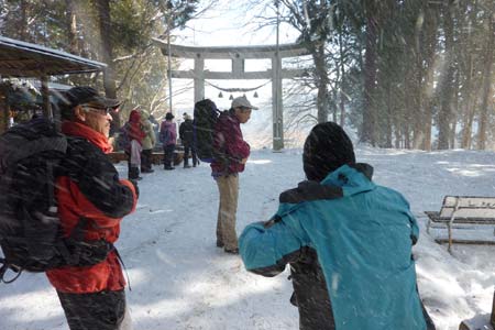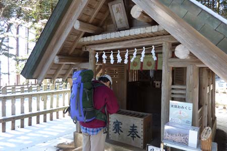 | 宝登山神社奥宮でabeちゃん(左)と合流 | 宝登山神社奥宮・伊藤さん 家内安全、ついでに宝くじが当たりますようになんてネ |