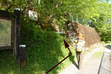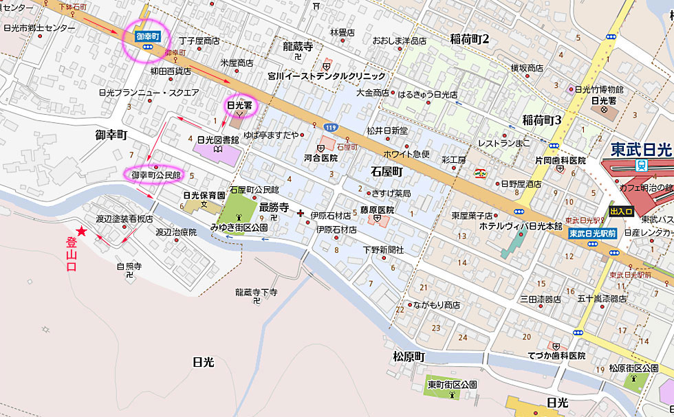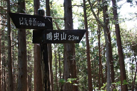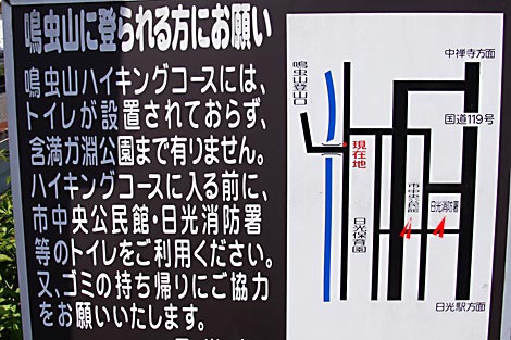 | 日光消防署前に鳴虫山登山口指導標あり | ||||