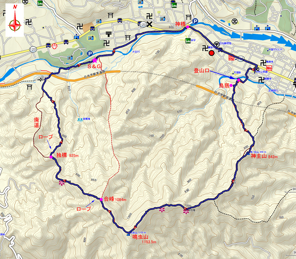 | (計曲線 50M 主曲線 10M) 含満街区公園P標高/620M 日光消防署標高/565M 標高差/538M 総歩行距離/9750M |