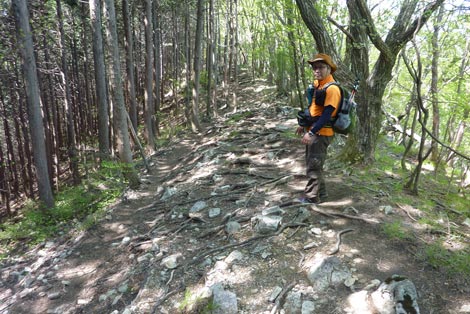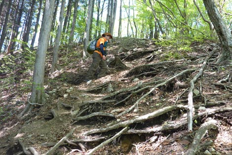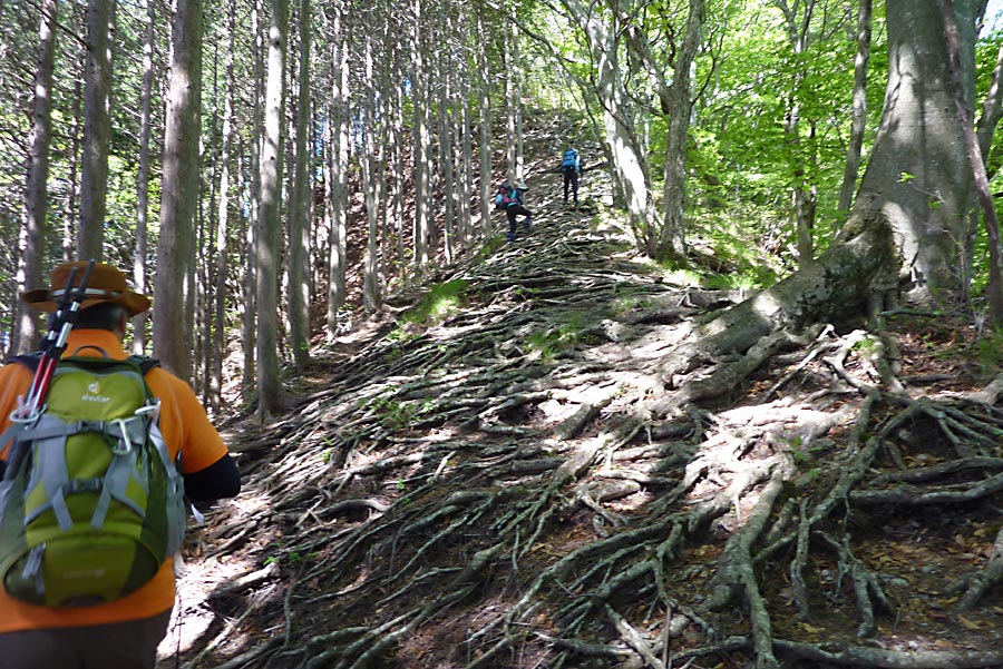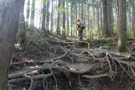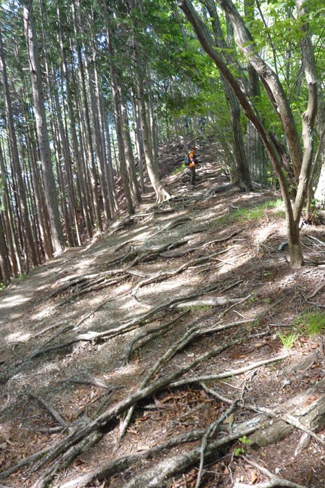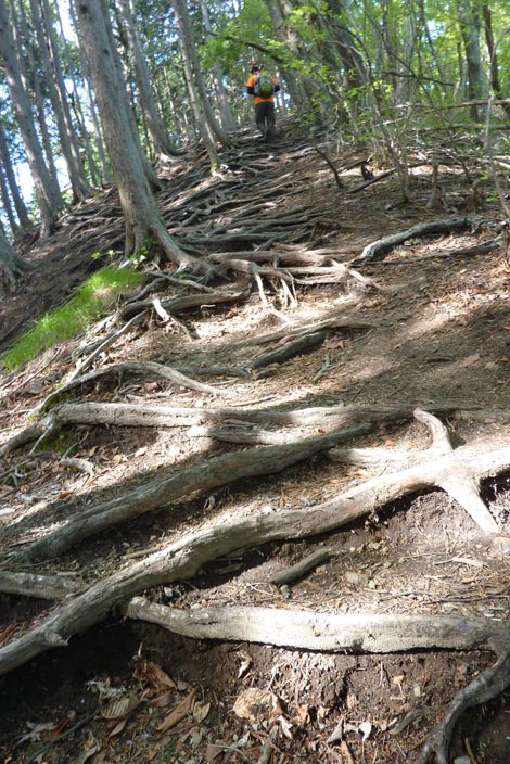 | この見事なまでの根っ子道! 下りでは使いたくないですね (;゜ロ゜) ※先行するご夫妻からは掲載許諾済 | ||||