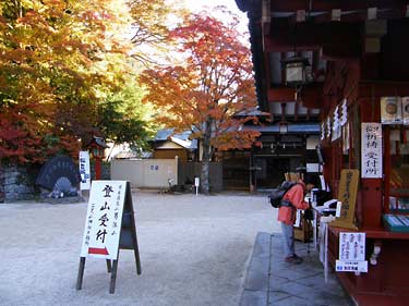 石段を登ったあたりから目にも鮮やかな紅葉が六合目まで続く。