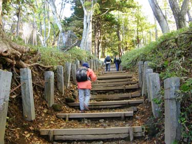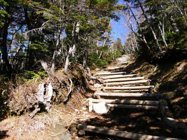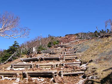 九合目からは斜面保護の木段が山頂付近まで続き、森林限界に入ると