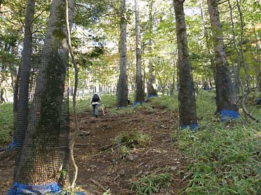 鹿などの食害除けネットが巻かれる 三合目から四合目の間は林道を歩く