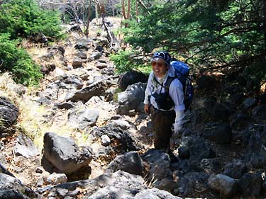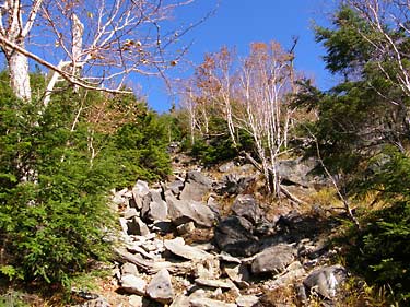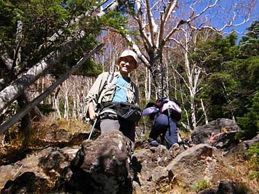 コメツガやシラビソの樹林帯に入ると岩ゴロ道の急登となるが、時折振り返って
