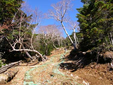 土砂流出防止&根っ子保護ネットで覆われた登山道