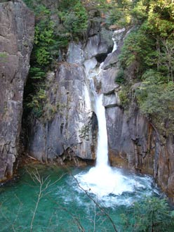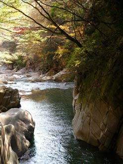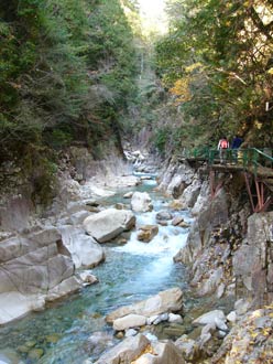| 柿其渓谷(かきぞれけいこく) 木曽川に注ぐ柿其川は、約8kmにわたって続く、滝や淵の渓谷美がすばらしい。 河口にあたる、柿其峡は切り立った白い花崗岩[かこうがん]と藍色の水が織りなす 景観が見事。 さらに林道を行き、柿其温泉を過ぎると、江戸時代の農家を移築した休憩処、 杣[そま]の家がある。 岩の水路を通って落ちる牛ケ滝へはここから徒歩15分ほど。 十二兼駅から歩くと約1時間30分のハイキングコースだ。 『南木曽町HPより抜粋』 |