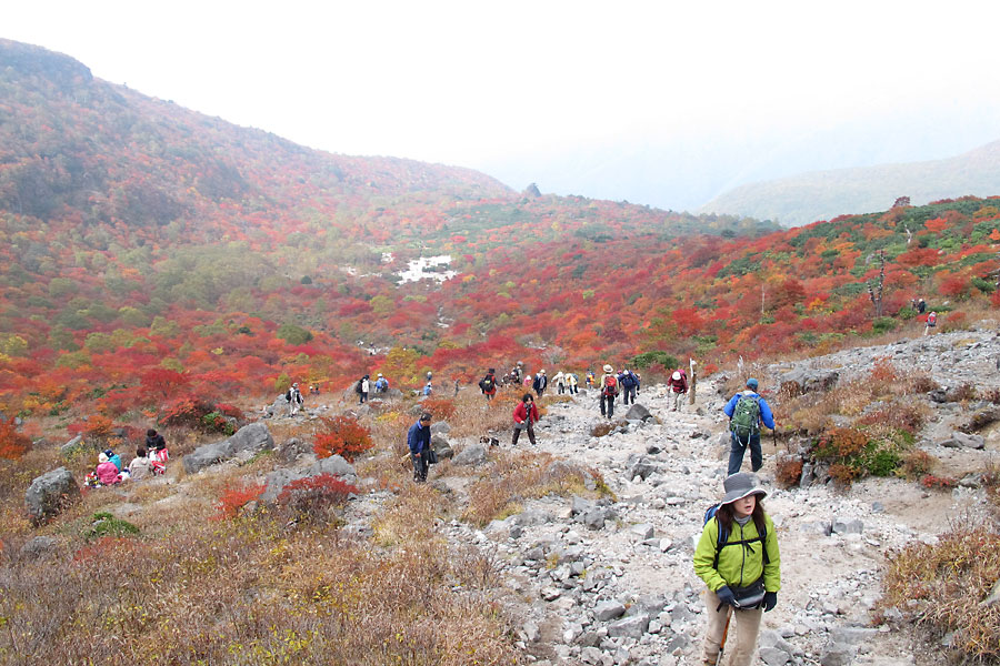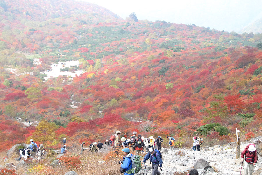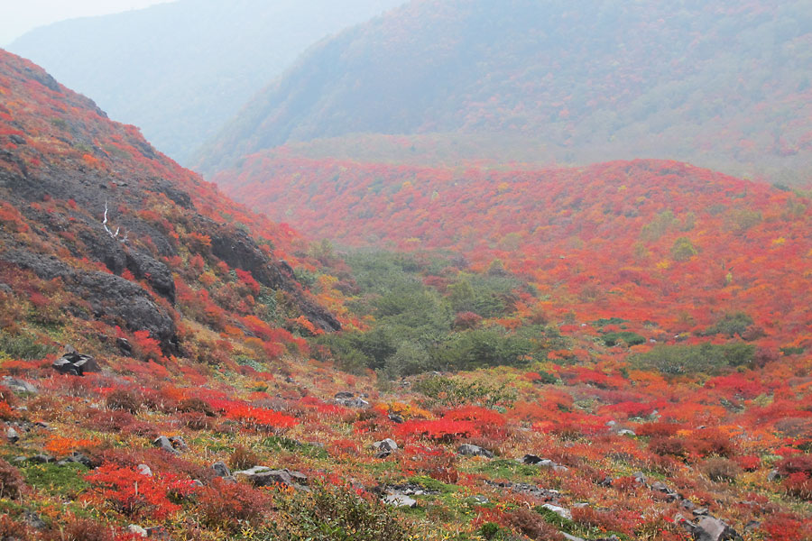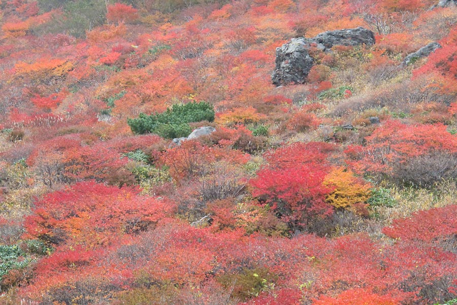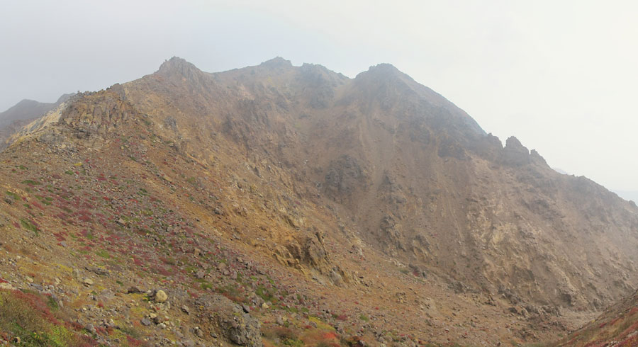 ガスっていたがこれだけ見えれば良しとしよう・・・朝日岳方面の紅葉 鳥瞰図:紅葉撮影地・3 |