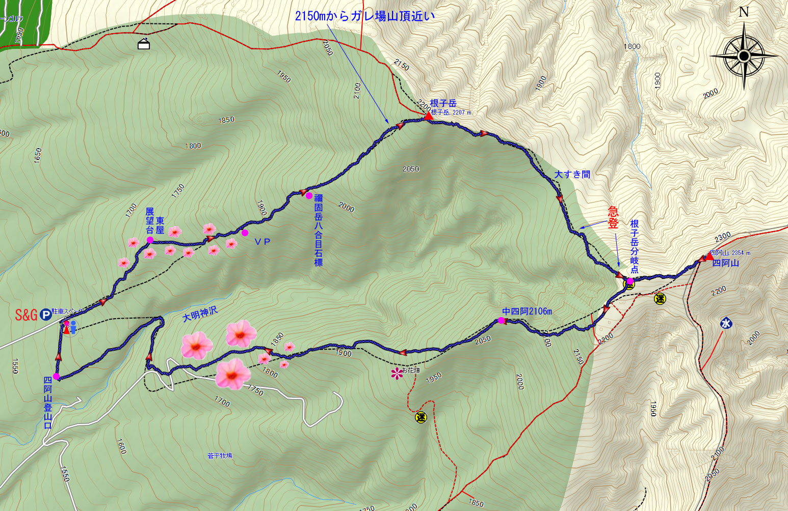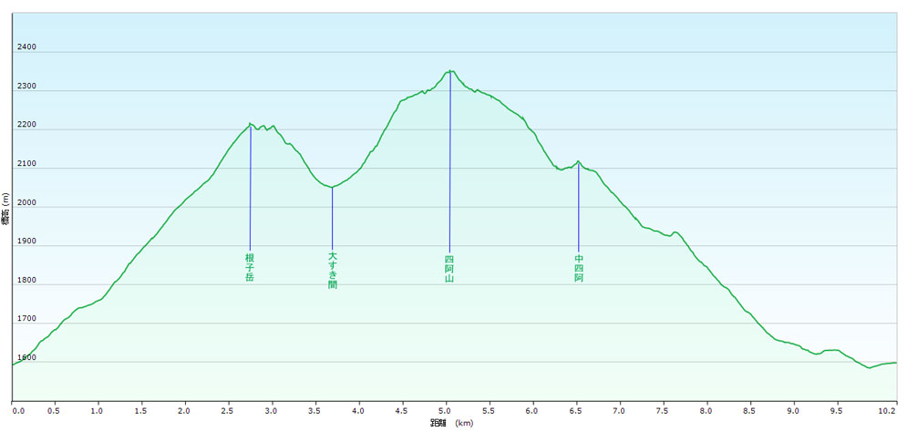 | 登山口標高/1590M 標高差/764M 総歩行距離/10181M | ||||