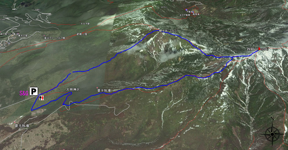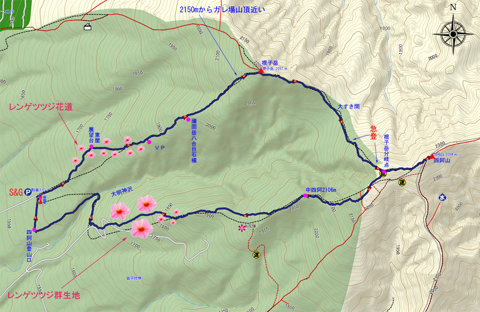 | 大明神沢 | 四阿山登山口に下山 | |||
