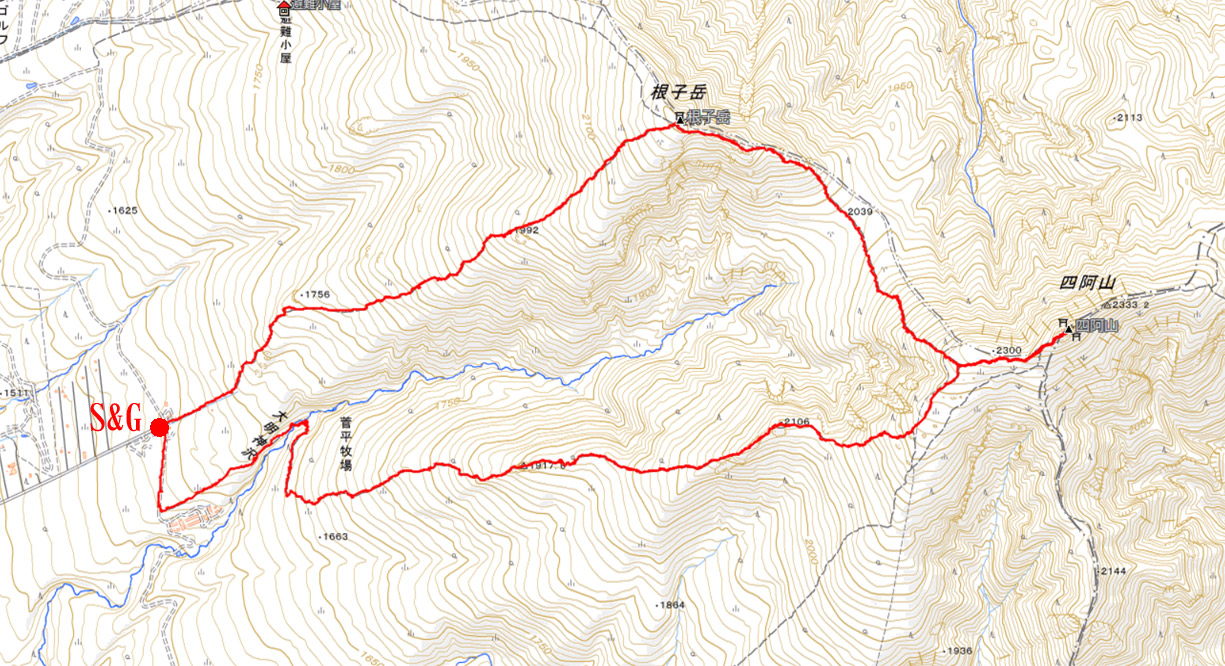 | 根子岳&四阿山ルート地図 (計曲線 50M 主曲線 10M) |