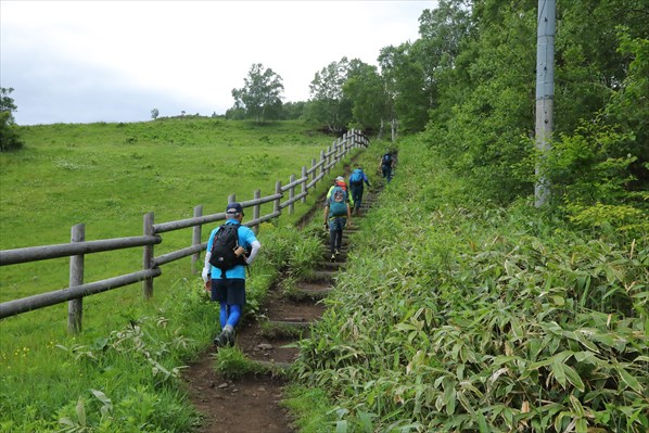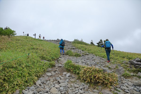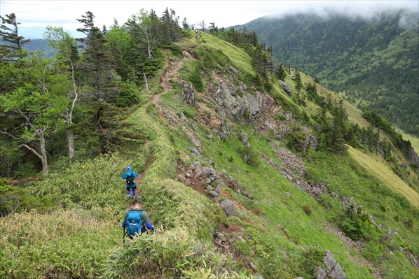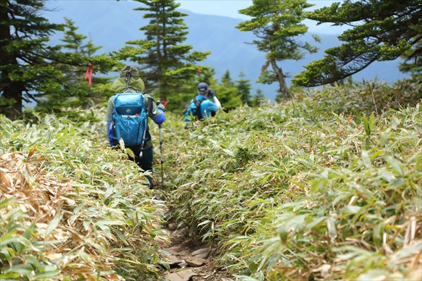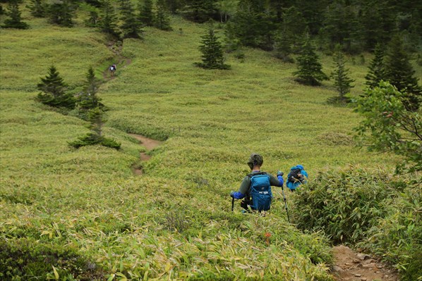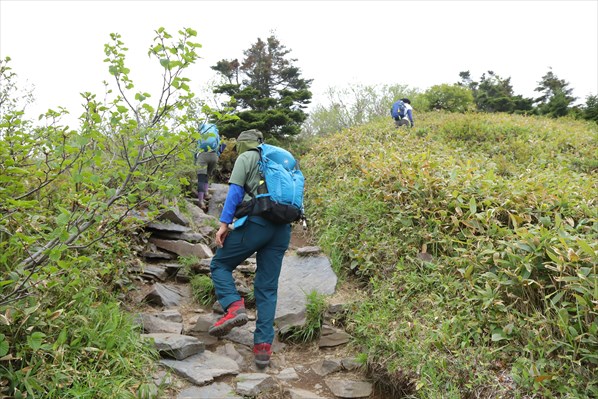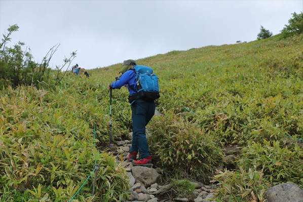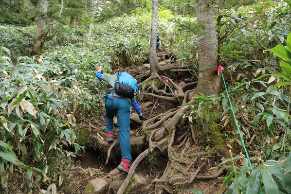 | 笹原の鞍部を通過する当ルート最難関「胸突き八丁」の急登に、、、 | ||||