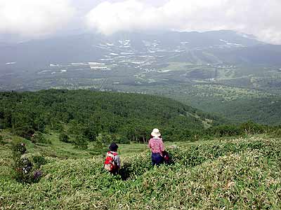 樹林帯を抜けた場所で菅平高原を展望。(あと少しで山頂)