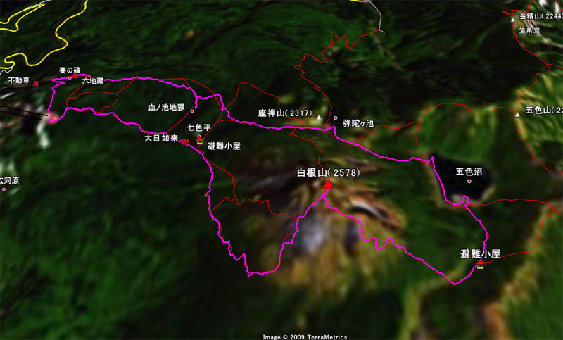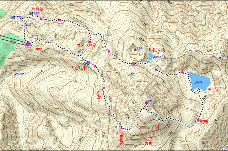 避難小屋〜五色沼〜弥陀ヶ池〜血ノ池地獄〜六地蔵〜RW山頂駅で下山 |