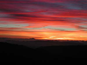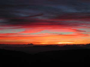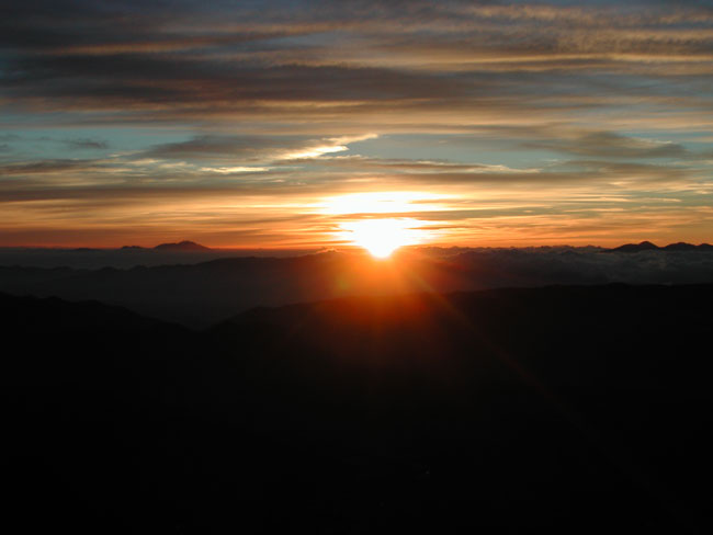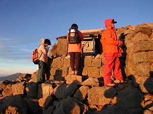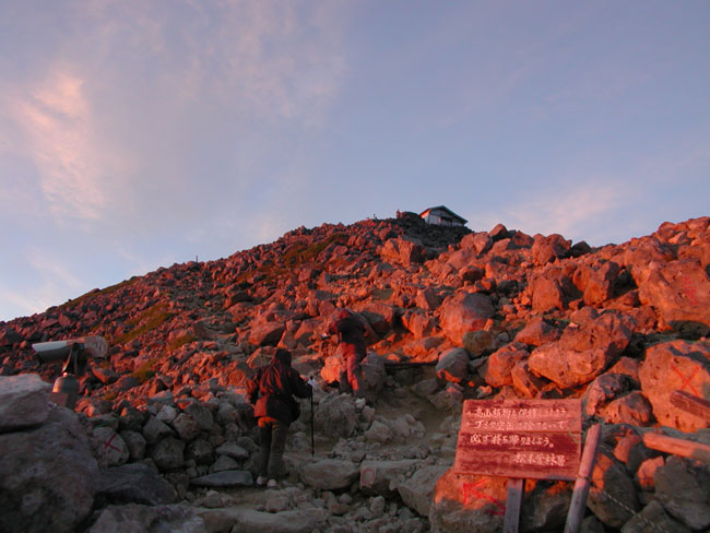 | 長野発 00:30 (中央道・松本IC〜乗鞍高原〜乗鞍エコーライン経由) 〜肩ノ小屋口駐車場着 am 2:50 登山口発(肩の小屋口) 3:35 〜肩ノ小屋 4:09 〜乗鞍岳山頂 4:55 (御来光を撮影後、朝食とコーヒータイム) 乗鞍岳山頂発 6:10 〜肩ノ小屋 6:45(休憩) 〜登山口着 7:20 2003年度からはマイカー乗り入れ禁止になります。 |