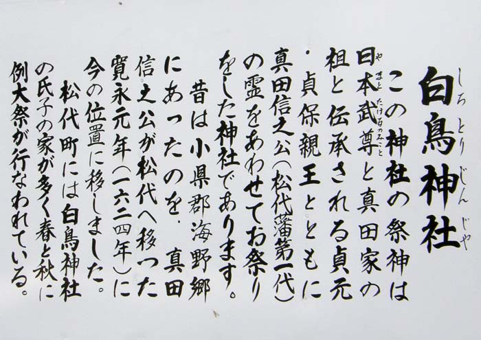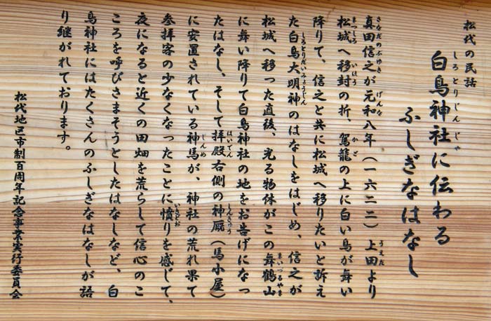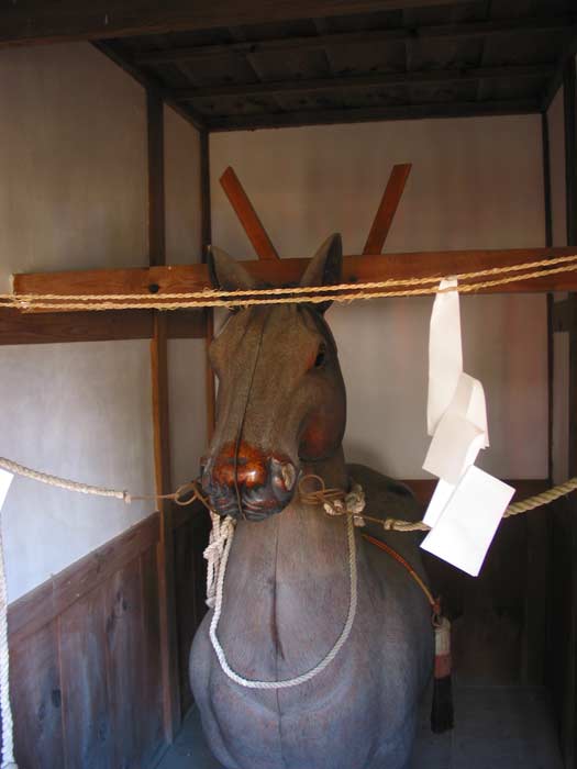| 長野市文化財/神馬(じんめ) 1849年に真田幸貫公が諏訪の立川和四郎という名匠に木造の神馬を造らせた。拝殿前右側の神厩に安置されており、 欅材の寄せ木造りの神馬は全身の細毛まで鮮やかに彫られている。 「白鳥神社の由緒」解説用紙より抜粋 |
