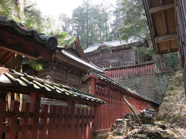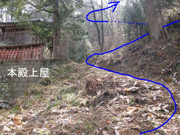 | 本殿上屋が下に見える(右の場所から撮影) | 前方を右に巻くとノロシ山の尾根筋に出る | |||