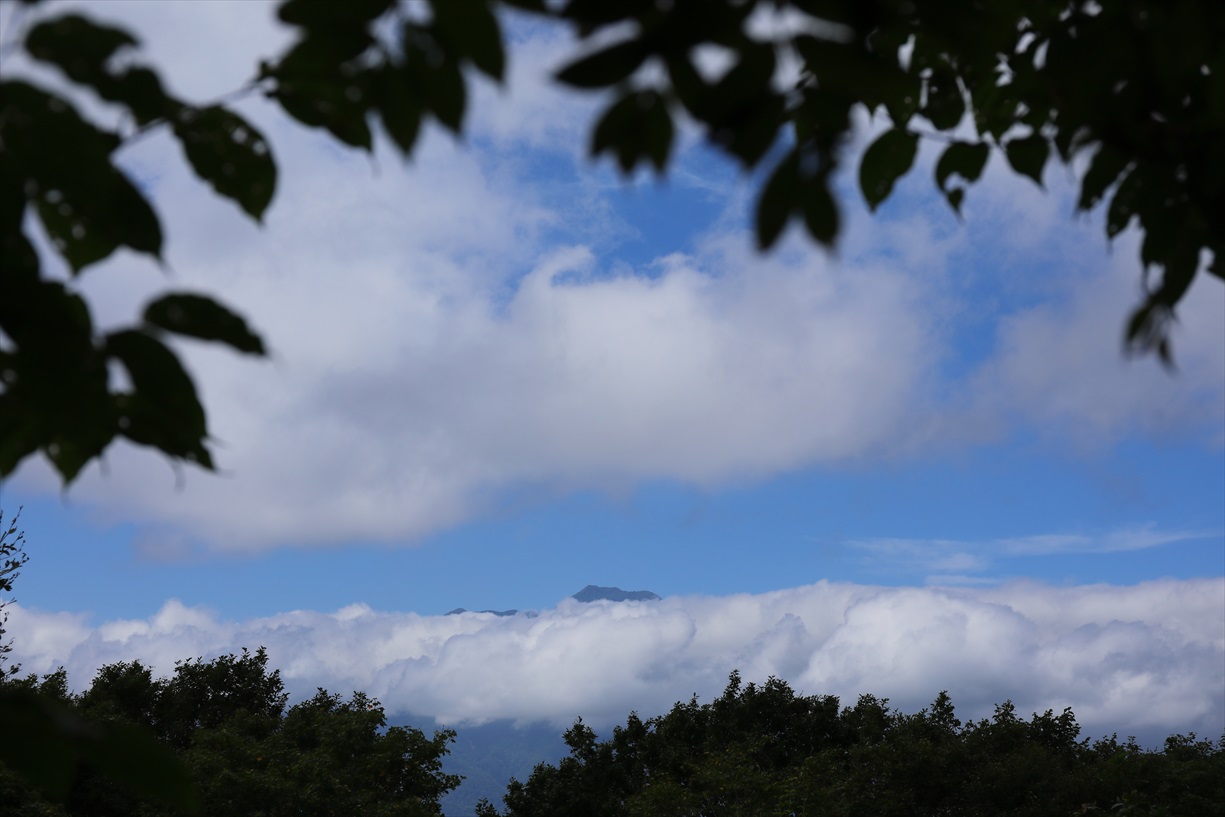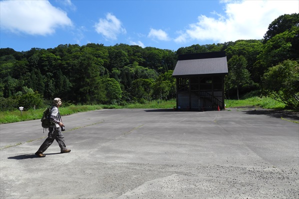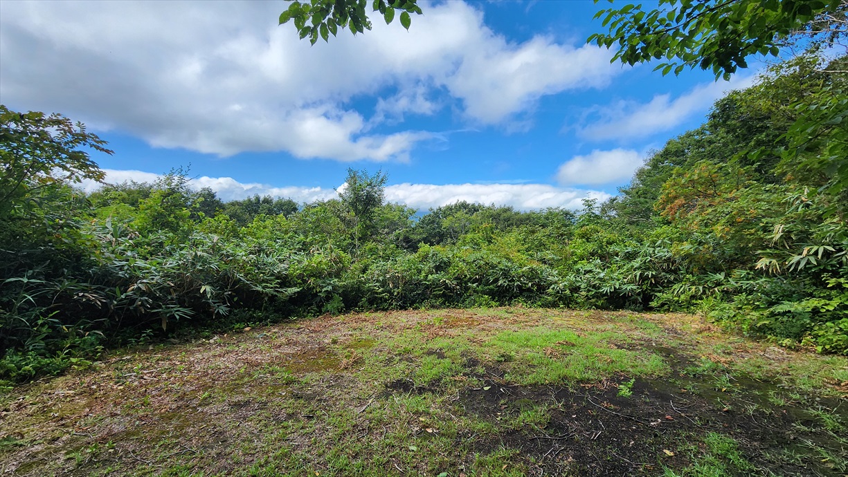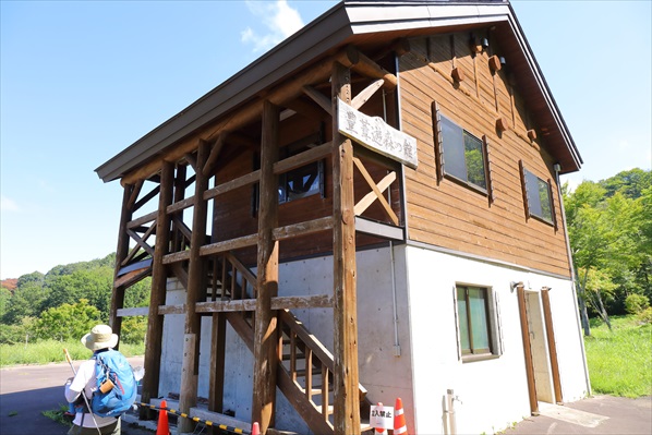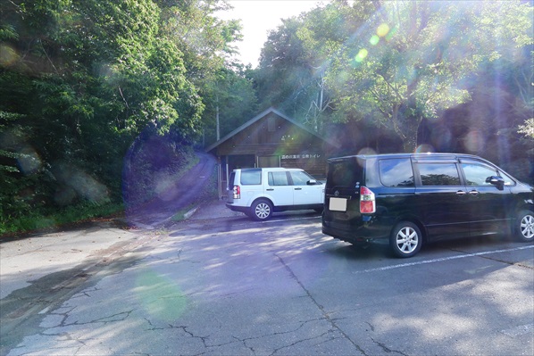 | 万坂峠・入山者カウンター/袴岳まで2.2` 樹木の隙間から斑尾タングラムの駐車場が見える |