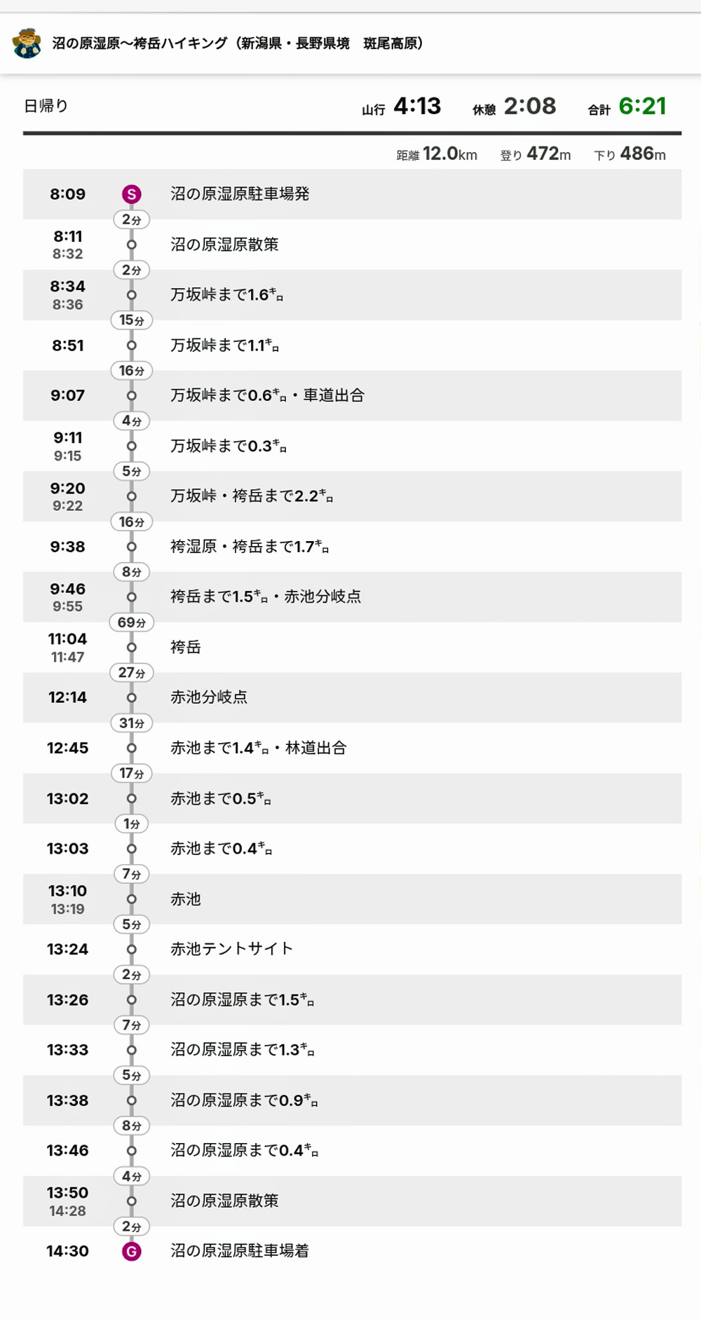 | 《沼の原湿原〜袴岳コースタイム他》 写真撮影時間20分〜100分含む |