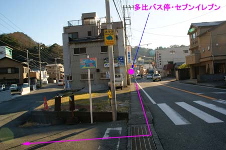 | 多比バス停横のセブンイレブン | 多比神社手前の横断歩道が目印 | |||