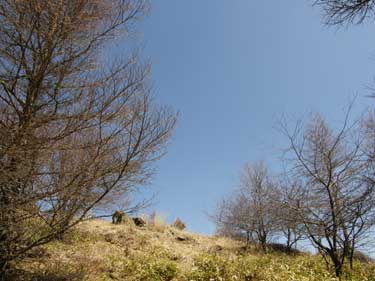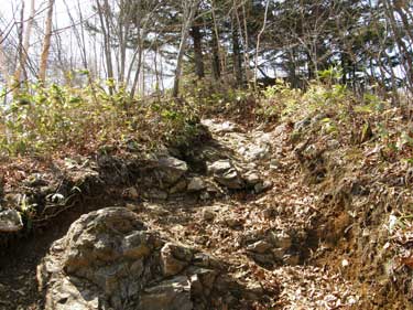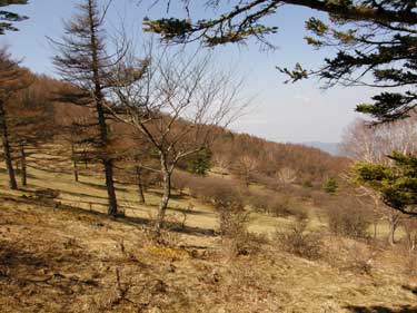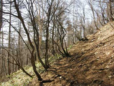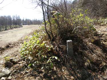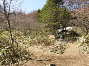 左側のミニゲレンデに沿ってカラ松林登ると、コース中間点に岩場迂回コースと書かれた道標が立つ。
