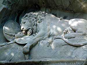 4日目:スイス:ルツェルン ライオン記念碑。 フランス革命時に戦死したスイス人786名 をたたえたもの。この後、屋根付きの木造橋 「カペル橋」を見学し、グリンデルワルトへ |