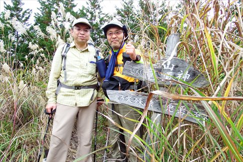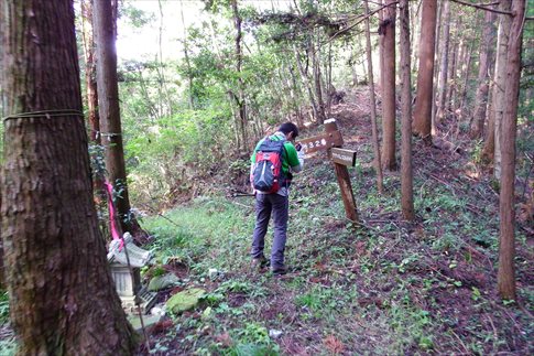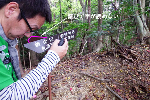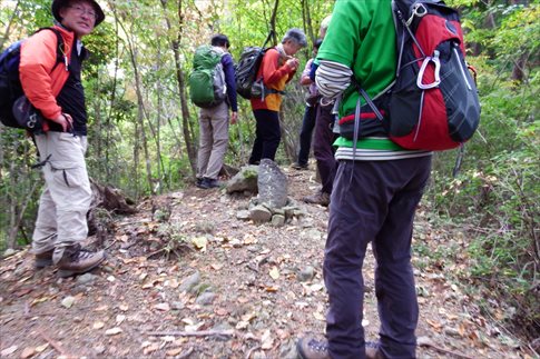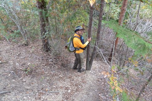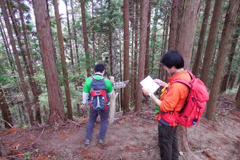 | ここが布沢峠と思われる/錆びついたT字型指導標が目印/mizuoさんナビチェック中 | ||||