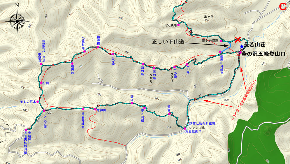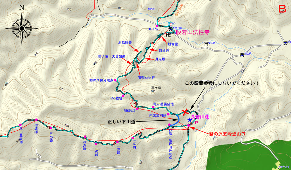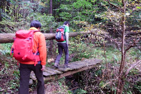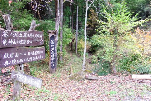 | 釜の沢五峰登山口 | 木橋の先に般若山分岐点あり | |||