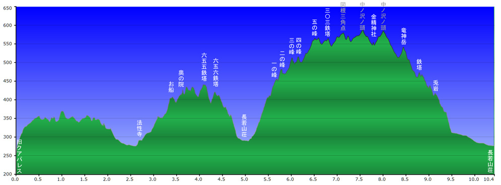 | 旧クアパレスおがの駐車場標高/256M 標高差/334M 上り累計/1027.6M 総歩行距離/10474M | ||||