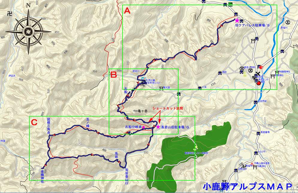 | 行程が長いのでABC区間毎の拡大地図を下段に作成 | ||||