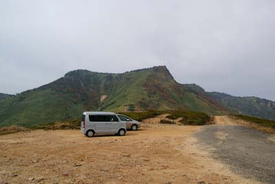 | 御飯岳の紅葉 | 毛無峠・毛無山側駐車スペースと破風岳 破風岳ルートは団体登山者で賑わっていた |