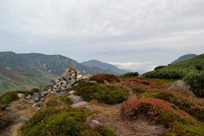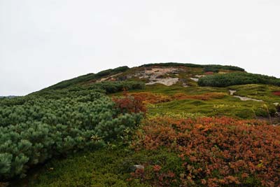 | 小串硫黄鉱山跡のなごりと毛無山 | ハイマツとクロマメノキの間をぬって毛無山へ | |||
