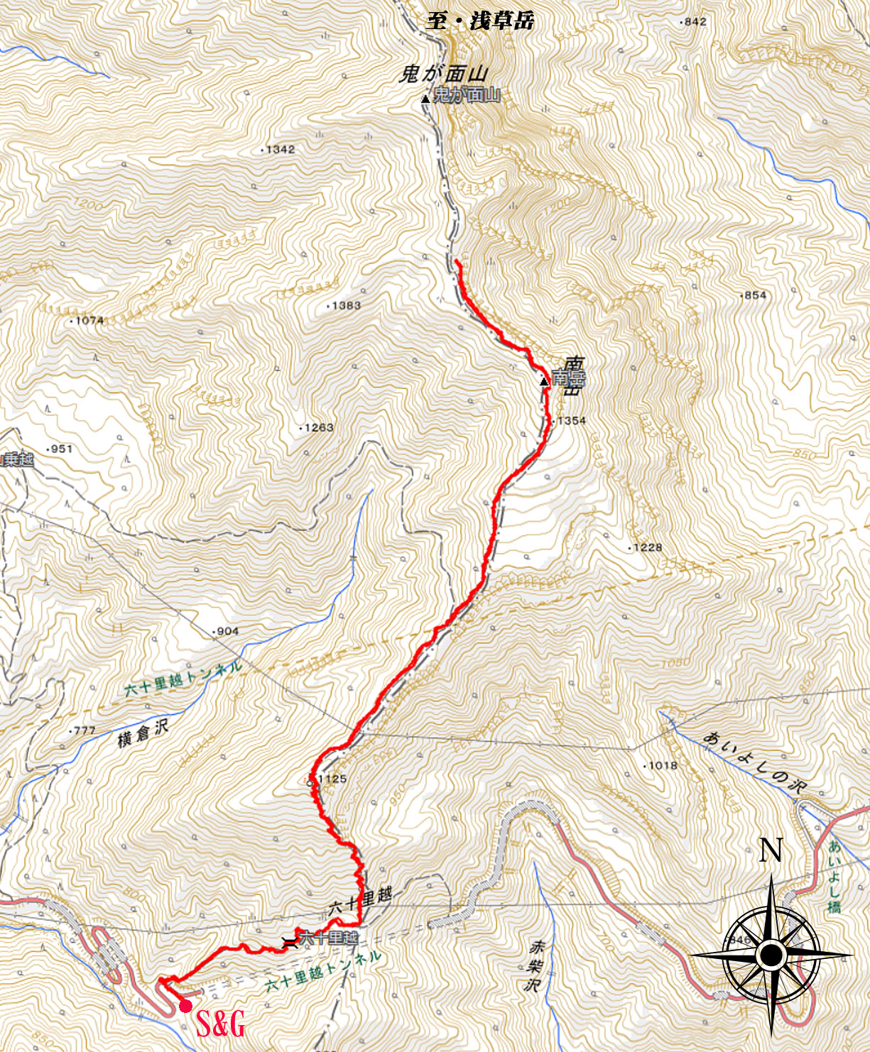| 鬼ヶ面山ルート地図 (計曲線 50M 主曲線 10M) |