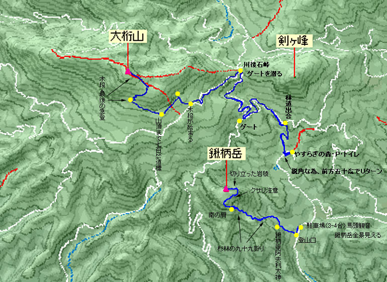 鍬柄山の岩頭部が見え、ここが行程中唯一の展望地で双眼鏡を覗けば