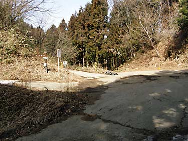 峠では指導標(山頂まで1.7km)に従いチェーンゲート脇から未舗装の林道に入る。