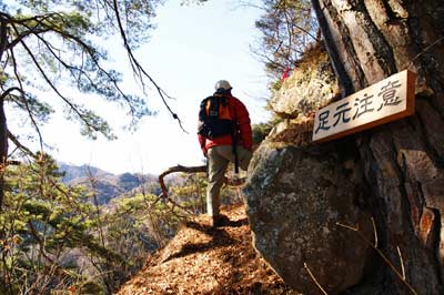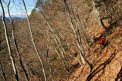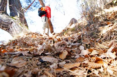 痩せ尾根の急坂に落ち葉が積もる |
