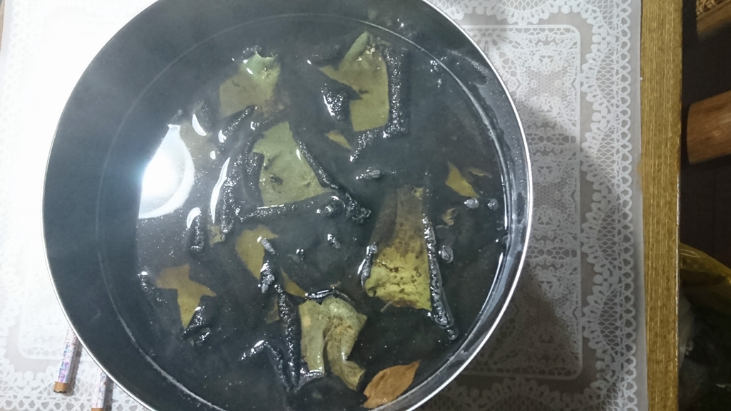 | 40年50年の汚れを落とす必要があるため、先ず熱湯でヒタヒタにすると日光を浴びていた表面が緑色になります。 ★ぬるま湯程度まで冷めたら流水で濁り水がなくなるまで何回も何回も「もみ洗い」をします (このもみ洗いは最終行程でもおこないます) |