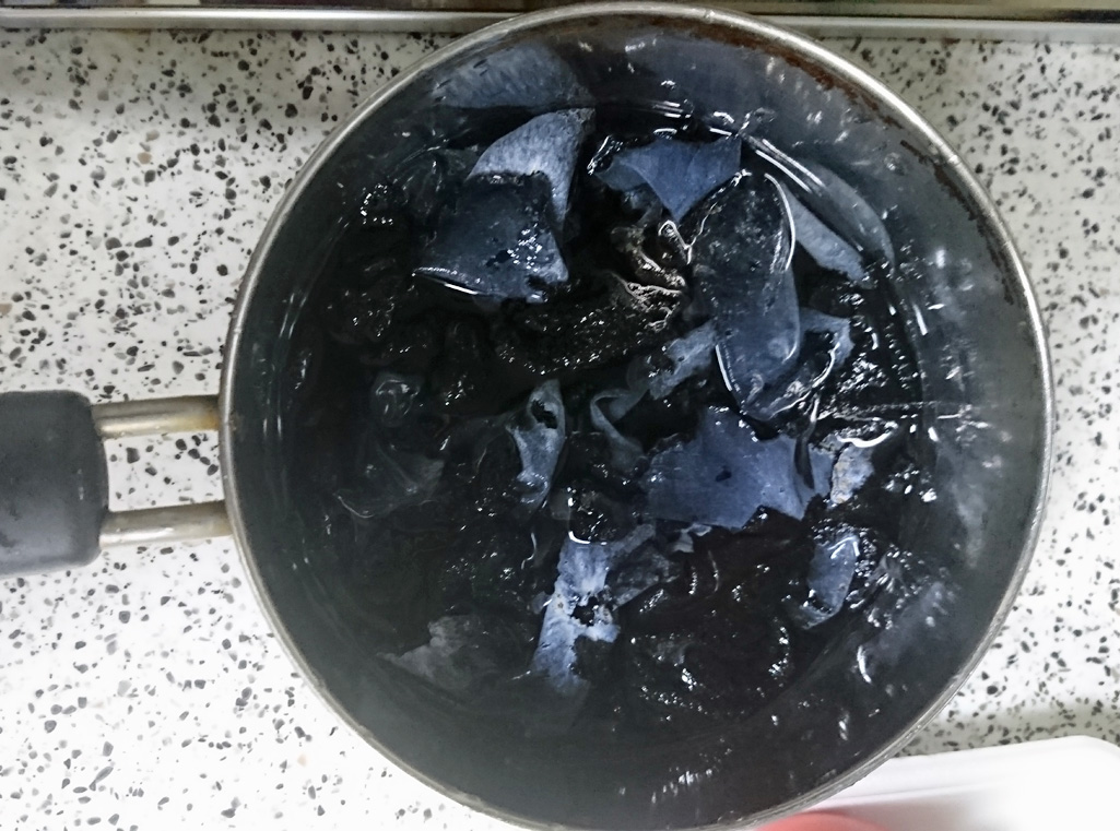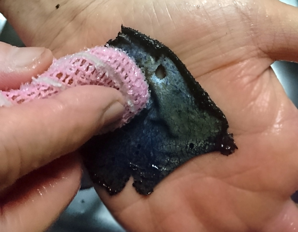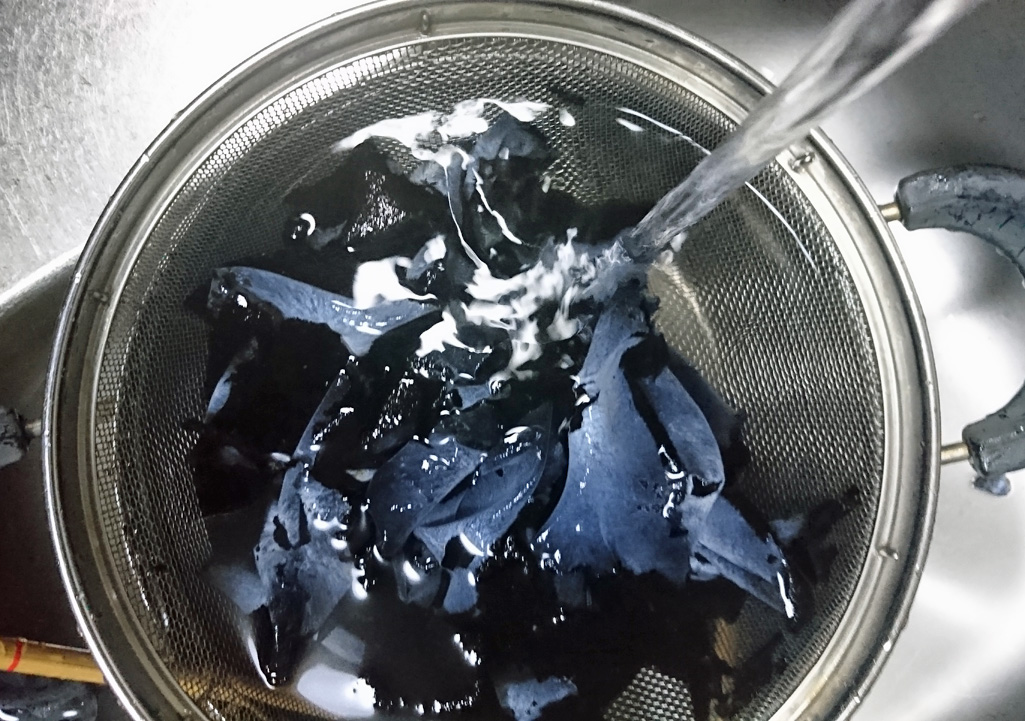 | 《最終行程》 裏側の黒い部分に汚れが残っているので濁り水がなくなるまで何回も何回ももみ洗いをして下ごしらえ終了! |