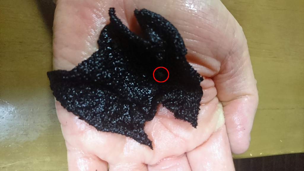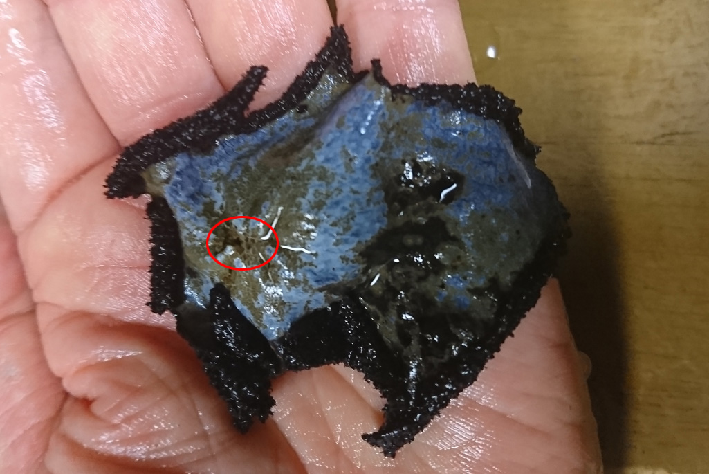 | 岩にへばりついている裏側部分 赤丸はキノコでいう「石づき」の箇所なので手で取り除く |