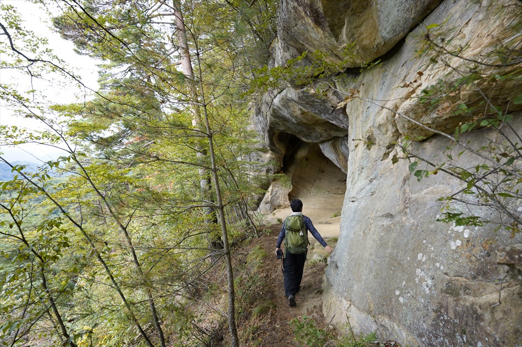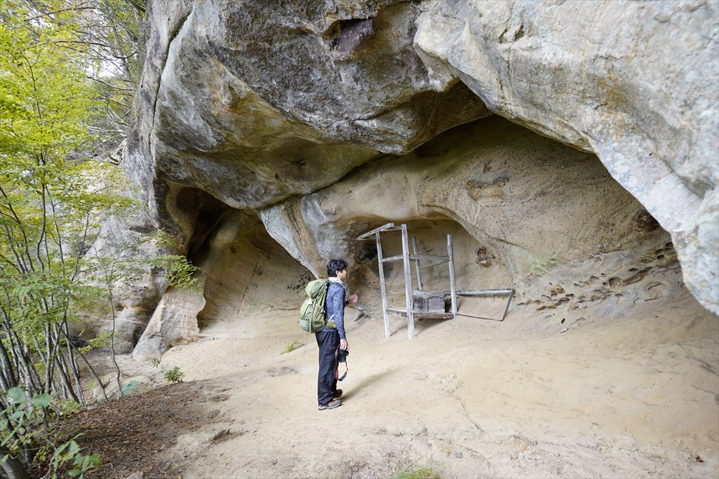 | 大姥神社奥宮の大穴 大姥と金太郎の住居・洞窟奥の岩の割れ目に耳を当てると「海の音」が聞こえると伝わる |