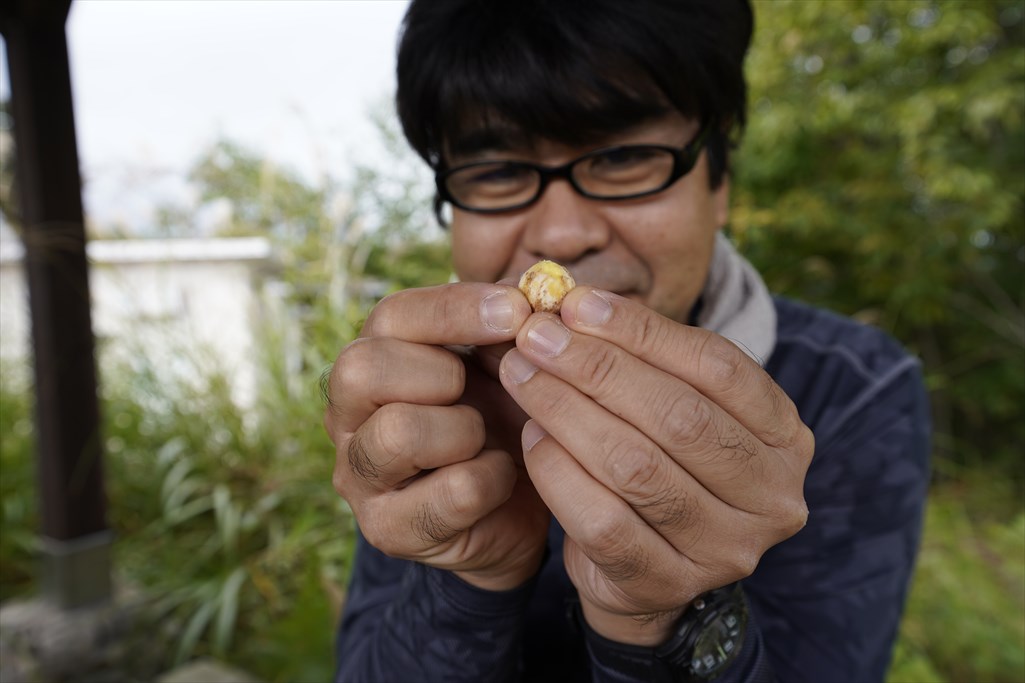| 栗って生で食べられるの〜? と、疑心暗鬼な山浦さん 爺、ガキののころは山栗や山クルミは貴重な食材! 渋皮を前歯でガリガリって削ってポリポリと食べると美味しいです♪ |